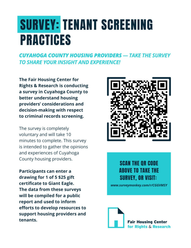 The Fair Housing Center is conducting a survey of Cuyahoga County housing providers to better understand housing providers’ considerations and decision-making with respect to criminal records screening. We feel gathering the perceptions, experiences, and voices of landlords and housing providers is a crucial component of developing sound housing policy and finding the most effective ways to bolster fair housing outcomes.
